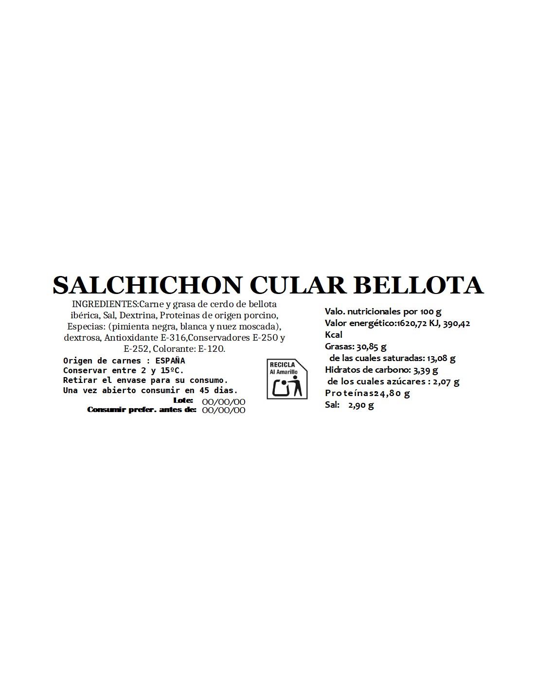 Mélange de porcs ibériques maigres nourris au gland, additionnés de sel de mer naturel, de poivre noir, d'épices et d'additifs autorisés, pétris et farcis dans un boyau naturel. Le poids de la pièce est d'environ 600 grammes et se caractérise par son arôme et sa saveur, indispensables dans la gastronomie espagnole la plus sélecte.