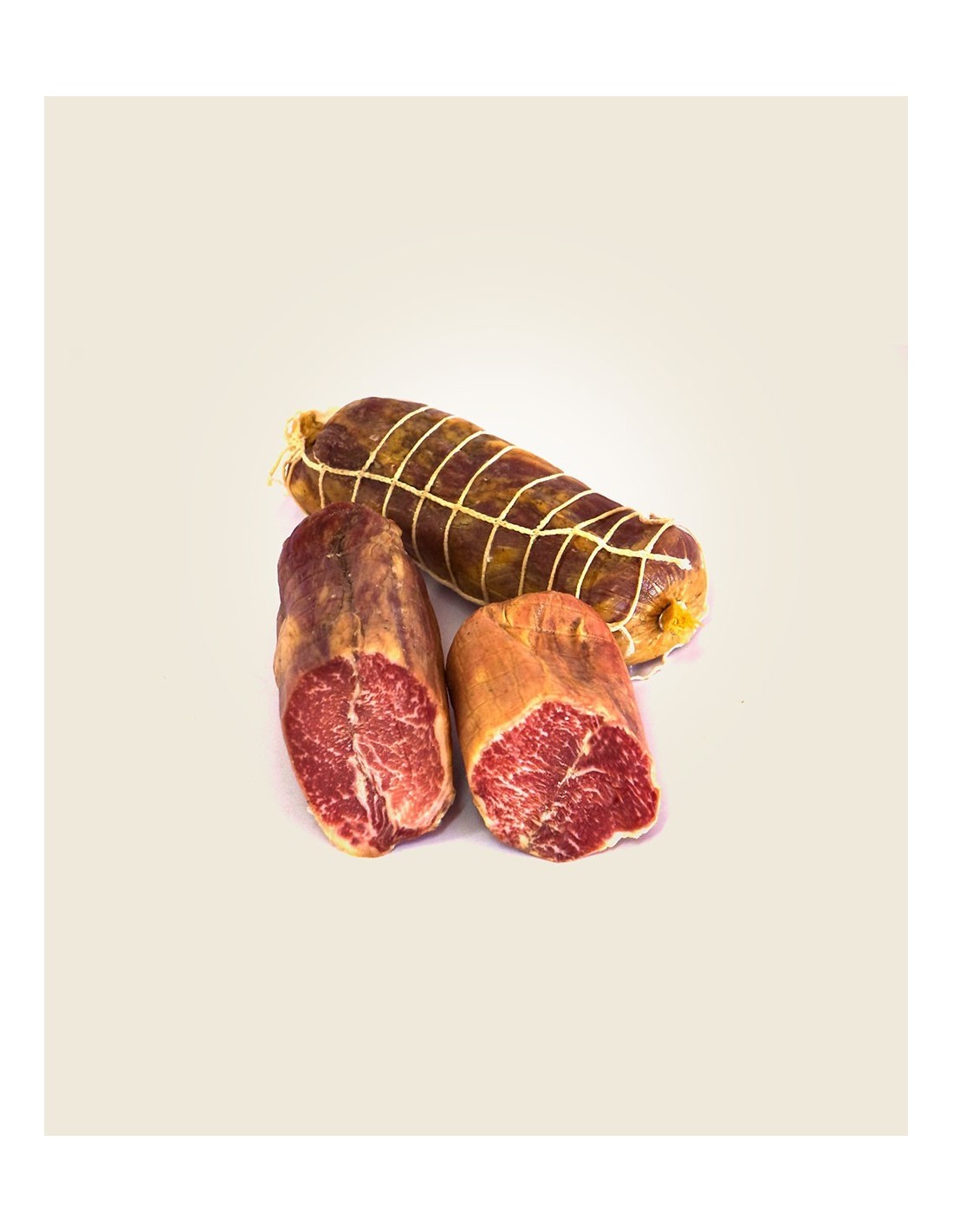 The loin is the entire piece corresponding to the lumbar muscle mass of pigs. The 100% acorn-fed loin is one of the most valued pieces of the Iberian pig for its incomparable flavor and aroma. It is characterized by its red color, and its marbled appearance. Unlike the other types of loins, its differentiating characteristic is the stuffing, which, as its name suggests, is stuffed doubled, and that is why it needs a longer curing time, thus achieving a greater bouquet and a very particular aroma. .