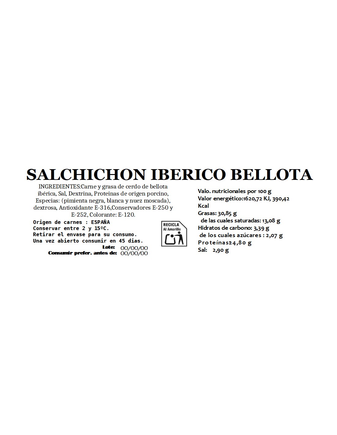 C'est le produit de la sélection de porc maigre ibérique nourri au gland dont le hachage est plus fin que pour le saucisson cular, additionné de sel marin naturel, de poivre noir, d'épices et d'additifs autorisés. Il est encastré dans un boyau artificiel, ce qui lui permet d'être des pièces d'un calibre et d'une longueur homogènes. Sa forme est en fer à cheval et son poids de 0,350 kg. environ. La vente se fait par lot de 2 pièces.